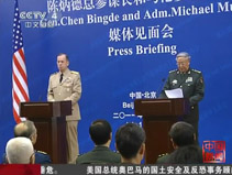 解放軍總參謀長陳炳德上將11日上午與來訪的美軍參聯會主席邁克爾•馬倫海軍上將舉行會談后,共同會見了中外記者。陳炳德指出……