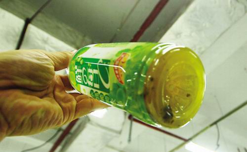 在路邊便利店買(mǎi)了一瓶“康師傅”葡萄汁飲料,仰脖喝下大半瓶后,突然感覺(jué)有異物,對(duì)著燈光細(xì)看,竟發(fā)現(xiàn)飲料瓶里沉淀有許多黃色的絮狀物品,還有一坨黑乎乎的沉淀物,這是10月16日晚陳先生在福州道山西路一便利店遭遇的一幕。