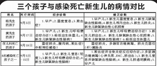 家屬們認(rèn)為,兩位孩子死亡癥狀與公布的8名死亡患兒驚人地相似(見左表),醫(yī)院感染問題應(yīng)該不只是這11天,以這么具體的時間劃分孩子的死因,顯然違背科學(xué)精神。