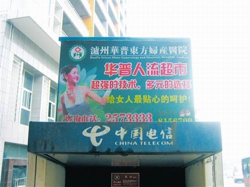 本學(xué)期開學(xué)以來(lái),一位瀘州十五中女生家長(zhǎng)多次打來(lái)電話,反映學(xué)校附近人行道電話亭上的華普東方醫(yī)院廣告涉嫌違規(guī)!疤幌裨捔,他們居然打出‘人流超市’的宣傳。是不是說(shuō)‘人流’就像進(jìn)商場(chǎng)買東西一樣簡(jiǎn)單嘛?”該家長(zhǎng)認(rèn)為,人工流產(chǎn)是一件對(duì)女性身體傷害極大的事情,年輕女性應(yīng)該盡量避免。醫(yī)院如此打出人流廣告,是暗示人流像在超市購(gòu)買商品一樣簡(jiǎn)單,對(duì)女性尤其是少女健康不利。“他們還把廣告打在學(xué)校附近,對(duì)正處于成長(zhǎng)發(fā)育期的孩子非常不利。我真擔(dān)心女兒受到影響!”接到家長(zhǎng)反映后,記者在城區(qū)連江路十五中附近和前進(jìn)中路一帶發(fā)現(xiàn)了這些廣告。廣告都發(fā)布在人行道電話亭頂部,約兩平方米大小,除了宣傳醫(yī)院名稱、超強(qiáng)技術(shù)等內(nèi)容外,“華普人流超市”作為廣告主體內(nèi)容顯得格外顯眼。
