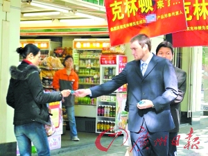 昨日,一位名叫“克林頓”的人在東莞街頭給消費(fèi)者免費(fèi)派發(fā)其代言的安全套(見上圖)。不過,這位“克林頓”可不是前美國總統(tǒng)比爾·克林頓,而叫威廉·比利·克林頓,加拿大人。對(duì)于商家的宣傳手法,有市民質(zhì)疑這是借美國前總統(tǒng)克林頓的名字來制造噱頭。(記者 周偉涵 通訊員 黃菲 攝)