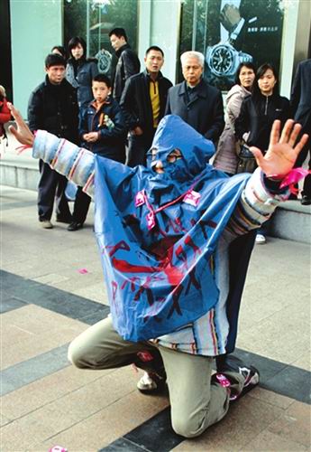 行李袋往地上一撂,佟鑫扯出藍(lán)雨衣麻利地往身上一套,變身成“超人”:只露出眼睛和嘴巴。接著,他開始走“貓步”,每往前邁出一步,就從兜里掏出安全套扔在地上,在地上擺出了“又”字。然后,他突然走近電視臺(tái)攝像機(jī),劈開馬步,一邊對(duì)著鏡頭揮舞雙手,一邊用英文念著:“Stopaids……”兩名逛街的“老外”也被吸引過(guò)來(lái),看到雨衣上的圖案,立即會(huì)意。其中一人撿起一個(gè)安全套,連聲稱贊“Good!”