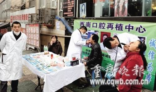 記者立刻前往調(diào)查,發(fā)現(xiàn)這三名中年男子身著白大褂,白大褂上印有“重醫(yī)大附二院”等字樣,面前的一張桌子上,擺滿了假牙、醫(yī)藥棉花和一些瓶瓶罐罐及資料!拔覀兌际谴筢t(yī)院的醫(yī)生,周末出來治病兼宣傳!币娨恢心昴凶訙惿蟻恚状蠊拥囊荒凶恿⒓礋崆檎泻,隨即拿起手術(shù)鉗就往患者口腔里插。