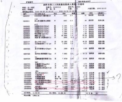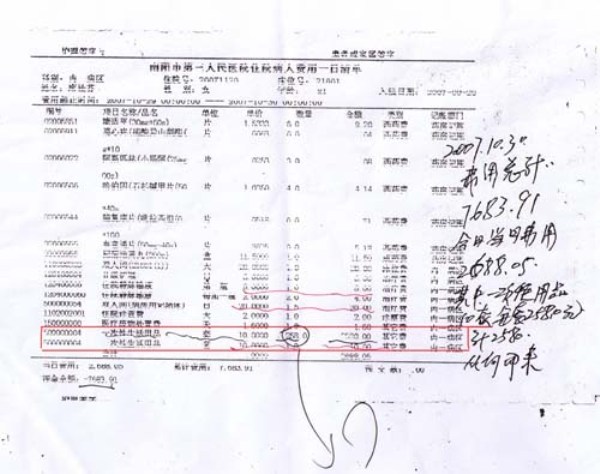李冰拿著一厚厚一沓子住院清單說,每次住院時(shí)交100元押金后,病人即可使用醫(yī)院提供的被褥、茶瓶等物品,此外連一圈衛(wèi)生紙他們也沒用過,根本不知道價(jià)值10元錢的一次性用品是什么,何況一天竟用了258套!李冰還用筆把下列她認(rèn)為沒有消費(fèi)的項(xiàng)目作了標(biāo)記:2007年11月8日,開蜂蜜5瓶,計(jì)費(fèi)115元;奇正消痛貼10盒,計(jì)費(fèi)142元;2008年1月6日,開山甲若干,費(fèi)用552.50元;2007年11月8日陪護(hù)床位20張;2008年5月4日陪護(hù)床位15張。
