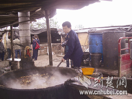 這名男子自稱曾某,來自紅安縣華河鎮(zhèn)。他交代稱,他從老家來武漢養(yǎng)了80多頭豬,但嫌養(yǎng)豬太辛苦,就以喂豬為名,以包月100元至400元不等的價格從吳家山、常青花園一帶的餐館買回殘渣剩菜,高溫處理后濾出表層的油,以每公斤2.6元的價格,賣給專門來收購的人加工成 “地溝油”流入市場。他稱每天僅濾出十多公斤的油,不過,執(zhí)法人員對這個數(shù)量表示質疑,因為僅在查處現(xiàn)場就發(fā)現(xiàn)約750公斤的“地溝油”。