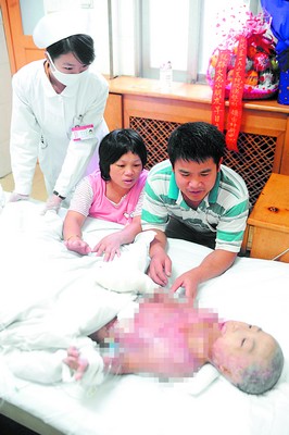醫(yī)生告訴雷麗娟,孩子75%面積燒傷,無法痊愈,“你們花100萬也治不好,就算治好也有可能落下殘疾!崩惥耆套⌒闹械谋矗瑩崦凝埳砩现刂匕陌准啿颊f:“不管你變成什么樣,永遠都是媽媽的寶貝!就算上街乞討,也要把你治好!”第二天,雷麗娟和丈夫帶著孩子先后來到長沙的4所醫(yī)院,但求醫(yī)未果。今年8月中旬,經(jīng)人介紹,孩子被送進解放軍163醫(yī)院燒傷整形·頜面外科中心,醫(yī)生確診其為“全身燒傷后疤痕攣縮畸形”。