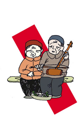 ☆吉利話扭倒費 身強體健的中年壯漢也有自己的乞討之道:在開門營業(yè)的攤點前耍獅子、打快板、送財神,不給錢就不走人,磨到你給錢為止。