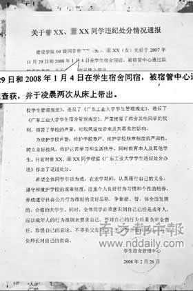 1月4日,廣州大學(xué)城某工業(yè)大學(xué)一女生留男生在宿舍過夜被學(xué)校抓獲,兩人近日被學(xué)校記過處分。這是該校在大學(xué)城校區(qū)首次對男女同宿現(xiàn)象公