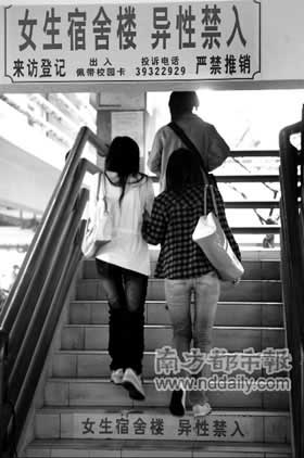 下午4點,記者在其中一棟男生樓進行了觀察。30分鐘內(nèi)共有5名女生,從沒設(shè)門崗的出入口進入男生樓。1個手提快餐,準備上樓的女孩告訴記者,她常常到男生宿舍玩,“4年來好像只登記過1次,管理員極少上門檢查”。