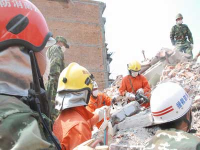 10時25分,消防官兵在對漢旺鎮(zhèn)災(zāi)區(qū)天池礦業(yè)公司家屬樓進行搜索救援時,突然聽到廢墟中傳來一陣微弱的呼救聲。還有幸存者!馬上進行救援!全力挽救幸存者的生命!隨著現(xiàn)場指揮員的一聲令下,參戰(zhàn)消防官兵在指揮員的嚴密組織下科學施救,充分發(fā)揮消防部隊的裝備優(yōu)勢和救援經(jīng)驗,迅速使用液壓剪、切割機迅速清除幸存者上方的鋼筋、鐵條等物,搬除身上埋壓的石板、水泥塊,為幸存者開辟救生通道。
