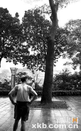 下午5時(shí)25分,記者趕到事發(fā)現(xiàn)場(chǎng),在離公園入口約150米處的一棵樹下有大一攤血跡,旁邊有兩個(gè)塑料袋。這棵鳳凰樹高約20米、直徑約20厘米,沒(méi)有明顯雷擊痕跡。幾位市民正拍著胸口在驚嘆自己險(xiǎn)些遭到雷擊。