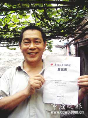 蔣必忠的愿望在7月24日這天變成了現(xiàn)實。那天下午,當他躺在病床上,用顫抖的右手在那張《重慶市遺體捐獻登記表》上歪歪斜斜簽下自己的名字后,他長長地舒了口氣。就這樣,這個59歲的直腸癌晚期患者,成為在北碚區(qū)紅十字會登記的首個農(nóng)民遺體捐獻者。