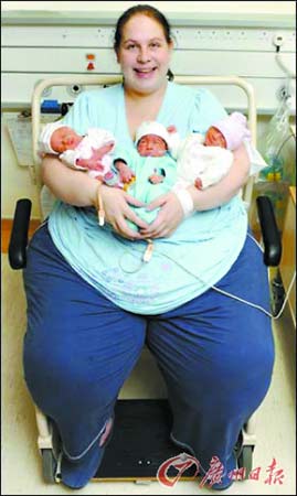 英國(guó)考文垂市體重達(dá)254公斤的產(chǎn)婦麗恩·索特近日成為全球最肥胖的三胞胎媽媽。她冒著極高的風(fēng)險(xiǎn),在68名醫(yī)務(wù)人員助陣下奇跡般地剖腹產(chǎn)下3個(gè)健康寶寶,并承諾為了照顧子女要減肥。