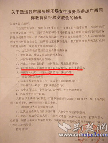 通過(guò)“糜瑞蘭”上傳的宣傳單照片,可以很清楚的看到這份全稱為《關(guān)于選送我市服務(wù)娛樂場(chǎng)女性服務(wù)員參加廣西同伴教育員經(jīng)驗(yàn)交流會(huì)的通知》的宣傳單中,抬頭為“各服務(wù)娛樂場(chǎng)所”,落款為“宜州市疾病預(yù)防控制中心”并蓋有相應(yīng)公章,其正文中列明交流會(huì)的主要內(nèi)容包括“……4、如何判斷客人的消費(fèi)能力……5、招攬客人技巧,與客人討價(jià)技巧,性技巧等”。該圖文內(nèi)容隨即被多個(gè)論壇轉(zhuǎn)載。