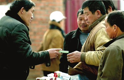在關(guān)東店停車場,呼家樓交通隊(duì)門口前的巷子里,有人向附近工地的民工和市民出售藥品,包括一些常見的感冒藥、消炎藥以及軟膏等。2月21日,家住朝陽的肖先生向本報(bào)提供了上述信息。肖先生說,這伙人是半個(gè)多月前才出現(xiàn)的,一共三人,推著堆積著藥品的三輪車和電動(dòng)車趁著夜色出沒!八麄円矝]穿正規(guī)的醫(yī)藥行業(yè)的衣服,出售的藥品要比藥店便宜很多,每天晚上7點(diǎn)多出現(xiàn),到10點(diǎn)多才走!