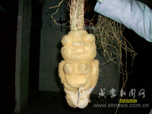 3月21日,在通城縣北港鎮(zhèn)莊前村的杭瑞高速建設(shè)工地,施工時挖出一個特大的何首烏。何首烏長相似一女性,雙眼突出,鼻口明顯,雙耳高聳,雙手雙腳如立正姿式,胸圍約40公分,身高35公分,重3600克。