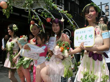 當(dāng)天正值第四十個(gè)世界地球日,成都文殊坊街上人流熙攘。這幫身披菜葉的年輕漂亮女子馬上就成為行人注目的焦點(diǎn),“喲,遠(yuǎn)看就只掛了些菜葉子在身上,原來(lái)還是穿了點(diǎn)紗的嘛,是不是又在搞什么商業(yè)活動(dòng)哦?”四川新聞網(wǎng)記者在現(xiàn)場(chǎng)看到,雖然沒(méi)怎么搞清楚狀況,但不少市民已經(jīng)掏出手機(jī)來(lái)開(kāi)始拍照。得知是群素食主義者的宣傳活動(dòng)后不少市民都打趣稱,“用穿得少的美女上街當(dāng)噱頭,肯定要轟動(dòng)!
