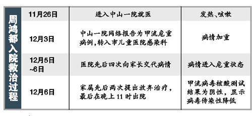 兒童醫(yī)院副院長(zhǎng)龔四堂稱(chēng),入院時(shí)周鴻都呼吸急促、血氧飽和量低、心率快、反應(yīng)差,當(dāng)時(shí)就上了呼吸機(jī),并且接受抗感染、糾正貧血等治療,入院的初步診斷是甲流、急性支氣管肺炎、呼吸衰竭、血小板減少性紫癜。到了第二天,他在呼吸機(jī)幫助下血氧飽和度已經(jīng)維持到正常水平,胸片顯示肺部大片感染,給予達(dá)菲等藥物治療。到了12月5日、6日兩天,他的病情進(jìn)入危重狀態(tài)。根據(jù)通報(bào),在12月6日,周鴻都的家屬共10多人來(lái)到醫(yī)院,先后兩次提出放棄治療,自動(dòng)出院。