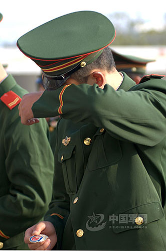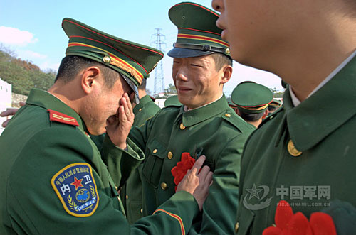 武警南京市支隊(duì)舉行退伍士兵歡送儀式,即將退伍的老兵和前來送別的戰(zhàn)士早已淚流滿面。中國軍網(wǎng)發(fā) 韓華攝