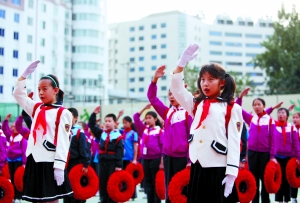 奮斗小學(xué)校長(zhǎng)見(jiàn)培炎介紹,學(xué)生們?cè)趦尚r(shí)的游行過(guò)程中主要是站立,在幾首固定歌曲響起時(shí),按照規(guī)定動(dòng)作舉起花環(huán),左右或前后擺動(dòng)2—3分鐘。