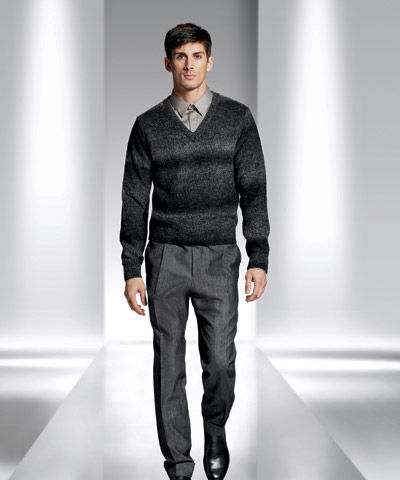 服裝的整體線條幾乎全都著墨于窄版、短身、合腰。而暗面布料如法蘭絨、羔羊毛、英國雪特蘭短羊毛、軋別丁斜紋防水布及粗氈羊毛,與亮面科技材質(zhì)如尼龍、絲、緞相互搭配,展現(xiàn)出強烈的視覺對比,富有華麗的時尚輪廓。色彩運用最受男士們歡迎的黑、灰、深藍、橄欖綠及咖啡色為基調(diào),點綴以亮紅、軍綠色,再度以反差色系突顯搶眼的風(fēng)格;而金屬材質(zhì)適時加入,更具畫龍點睛的效果。