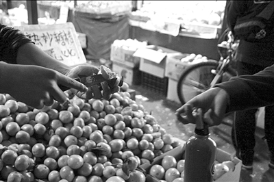 昨天,市民杜女士來到四道口明光寺批發(fā)市場的水果大廳購買橘子。她試吃了一家的橘子后感覺很甜,于是買了這家水果攤的橘子。但到家后她發(fā)現(xiàn),買來的橘子并不甜。一些常在該市場買水果的鄰居告訴了杜女士“水果刀的秘密”,隨后她再次返回該市場,親眼目睹了橘子“甜”的真正原因。昨天下午,記者來到四道口明光寺批發(fā)市場的水果大廳,見到一名攤主身邊有一個(gè)飲料瓶,飲料瓶在中間被挖掉一塊,瓶里裝著甜水。當(dāng)記者說要購買水果時(shí),攤主主動從那只裝水的塑料瓶中取出水果刀,切開水果讓記者品嘗。記者趁機(jī)蘸嘗了塑料瓶中的水,果然很甜。