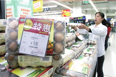 在沃爾瑪超市宣武門(mén)店,重新上架的咯咯噠雞蛋降價(jià)促銷(xiāo)。記者王磊攝