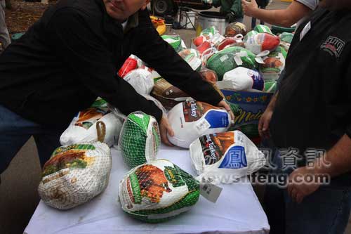 2008年11月25日,美國科羅拉多州丹佛市,人們在寒風中排隊等待領(lǐng)取感恩節(jié)的免費火雞和其他食物。丹佛市的慈善機構(gòu)計劃在感恩節(jié)之前向大約1200戶有需要的困難家庭發(fā)放感恩節(jié)食物。