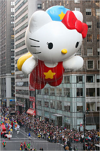 洛杉磯的小姑娘打扮成花季天使,和父母親一起參加十一月下旬的感恩節(jié)歡慶活動。感恩節(jié)連日長假,是每年美國人最重要的娛樂購物節(jié)慶之一。07年美國紐約在當(dāng)?shù)貢r間22日舉行了感恩節(jié)大游行,萬人參加場面熱烈。巨型卡通造型的氣球吸引了很多人?偣灿11個大氣球加入游行,其中包括在天上飄的凱蒂貓,吸引現(xiàn)場所有人的目光,多達800名小丑和11支樂隊,以及2000名拉拉隊員和舞者,將整個游行氣氛推向高潮。 一位紐約市民幽默的說:“我喜歡的是最后會出現(xiàn)的耶誕老人,因為這樣我們可以趕快離開,然后回家開始吃火雞!”