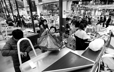 昨天下午2:30左右,記者在宜家商場內(nèi)看到,不少消費(fèi)者不顧昨天是上班日,紛紛翹班前往血拼。商場內(nèi)幾乎各個區(qū)域都擠滿了人。在收銀處,30個收銀臺前全部排起了長龍,幾乎每條隊伍都有近50米長。在一條通道口,一名保安指著身旁的一堆購物袋告訴記者,這些都是不愿排長隊買單的顧客留下的,因為東西買得不多,又不情愿排長隊付錢,所以寧愿不買了。