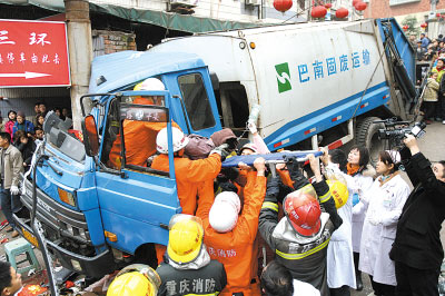 事故后不久,消防官兵和交警先后趕到現(xiàn)場。運渣車車頭嚴(yán)重變形,消防員迅速用破拆工具救出了環(huán)衛(wèi)工人張先陽和李國華,但營救最后一個被卡環(huán)衛(wèi)工尹修正時遇上困難。尹修正的腿已經(jīng)從變形車門的裂縫中伸出車外,因其全身被卡,消防無法實施協(xié)助救援,硬拉又怕其難忍疼痛,他們只有一點一點地邊擴(kuò)張、邊移動,最后又因空間狹窄,只得用起重機(jī)將運渣車向后拖移了20厘米,1個半小時才將尹修正救出。隨后,他被緊急送往新橋醫(yī)院。據(jù)了解,傷者全都脫離生命危險。中午12點半,運渣車最終被運走。此次救援工作耗時4個小時。