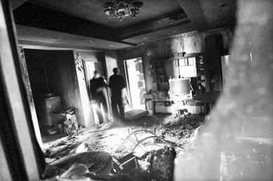 昨日上午9時30分許,記者在火災現(xiàn)場看到,房屋客廳內(nèi)一片狼籍,地板、沙發(fā)、電視機等都被燒毀,窗戶被撬開,墻壁都被熏黑了,門前有一個使用過的滅火器。 民警、消防人員正在勘查現(xiàn)場。