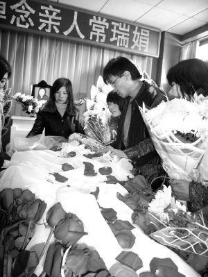 昨天上午9時(shí)許,八寶山殯儀館百合廳門前聚集著許多手持菊花的人,他們都是為常瑞娟送別的。隨后,娟子的男友劉貴年帶著娟子的家人走進(jìn)百合廳。他面容憔悴,嘴唇毫無血色。殯儀廳的中央,娟子靜靜地躺在那里,身穿潔白的婚紗,身上被鮮艷的紅玫瑰花瓣簇?fù)碇。“在她病危的時(shí)候,我問她還能堅(jiān)持嗎?她拉著我的手,用盡全身力氣重重地點(diǎn)了點(diǎn)頭!眱x式上,劉貴年望著女友的臉述說著她的堅(jiān)強(qiáng),一直忍著只是哽咽的他突然發(fā)出撕心裂肺的哭聲。在他身邊,娟子的父母姐妹早已泣不成聲,在場的人無不流下眼淚。在最后對遺體告別時(shí),劉貴年一直撫摸著娟子的臉。最后一刻,他突然低下頭,深深地吻向女友。