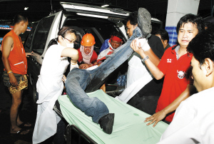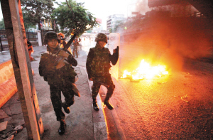 在泰國(guó)總理阿披實(shí)12日宣布曼谷和周邊5府部分地區(qū)進(jìn)入緊急狀態(tài)后,泰國(guó)軍隊(duì)和警察開始在重要路段部署兵力。13日凌晨4時(shí)30分,數(shù)百名士兵在丁當(dāng)?shù)貐^(qū)采取的驅(qū)散行動(dòng)中與示威者發(fā)生嚴(yán)重沖突。阿披實(shí)說(shuō),約70人在沖突中受傷,其中23人為士兵,大部分為催淚彈所傷,無(wú)人喪生。