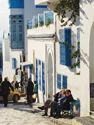 有一幢房屋,綠色的樹(shù)和紅色的花緊貼著白墻生長(zhǎng),只露出藍(lán)色的門(mén)窗。我恍惚起來(lái),這不是童話(huà)里最迷人的場(chǎng)景嗎?在這樣的場(chǎng)景里,藍(lán)色的門(mén)被推開(kāi),走出了童話(huà)里的阿拉伯公主,她回眸一笑,然后沿著鵝卵石小街邊的臺(tái)階,一步步地走下去,走到一望無(wú)際的地中海邊。我也沿著臺(tái)階走下幾步,那里是一個(gè)露天咖啡館,坐在木質(zhì)長(zhǎng)椅上,點(diǎn)一杯突尼斯人最?lèi)?ài)喝的薄荷茶,倚著欄桿,面朝大海,不知不覺(jué)間人便沉靜了下來(lái),漸漸地好像融化在純凈的藍(lán)色與白色里。