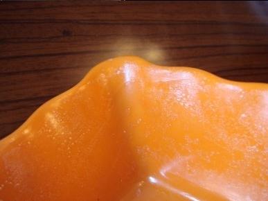 質(zhì)量差的仿瓷杯,經(jīng)蒸煮后變色、開裂。