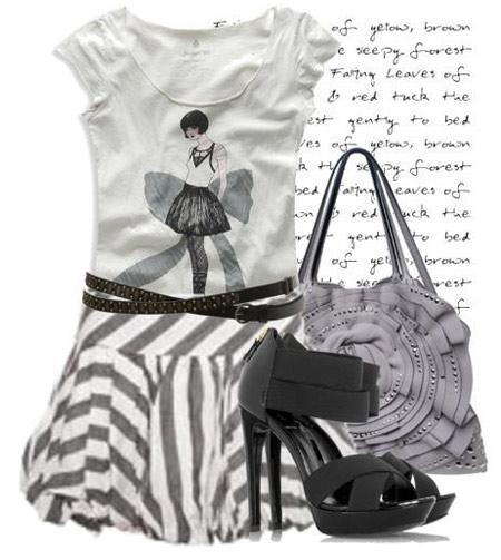 條紋高腰迷你裙加上纏繞式腰帶,顯出纖纖細(xì)腰,超高跟的腳踝涼鞋變身時(shí)髦女孩。