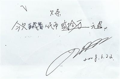 楚楚說,這張20萬欠條的簽名,有8條弧線,是雅暉的藝術(shù)簽名