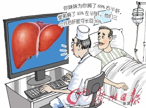 “患者親妹妹為他捐了69%右肝、堂弟捐了45%左肝,供受三方均穩(wěn)定平安,兩位供體三個(gè)月后肝臟可再生回95%,完全可以恢復(fù)正常的工作、生活!敝猩揭辉焊痹洪L(zhǎng)何曉順教授告訴記者,一切數(shù)據(jù)都是經(jīng)過嚴(yán)格精細(xì)計(jì)算,“切多了供體會(huì)出現(xiàn)肝衰,切少了受體不夠用!彼硎。