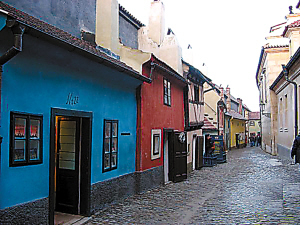 從修道院通往城堡的小街居然就是著名的黃金小巷。這巷子的出名其實是因為卡夫卡曾經住在這里,并完成了我們熟悉的小說《城堡》。黃金巷是一條由磚石鋪成的街道,街道很窄,原是皇室仆役聚居的處所,后來這里聚集了很多煉金術師,黃金巷由此得名。