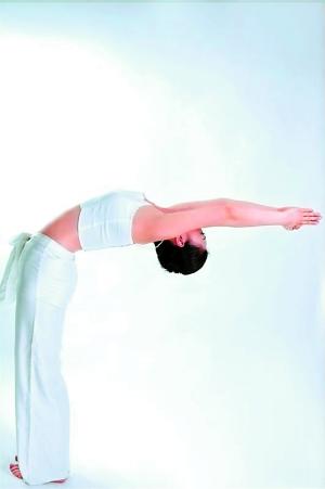 這是瑜伽中的“拱橋”動(dòng)作,對久坐者的腰椎很有好處,難度也比較大。沒有瑜伽基礎(chǔ)的人可以簡化動(dòng)作: 先仰臥,腿微屈,用手肘把身體支撐成一個(gè)拱形。