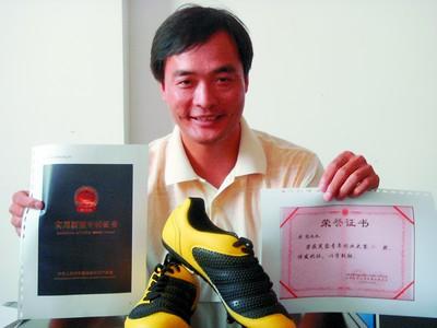 家住芙蓉區(qū)的周凱說,這雙球鞋的設(shè)計得追溯到幾年前!澳翘欤覐碾娨曓D(zhuǎn)播上看到貝克漢姆射出一個漂亮的弧線球,當(dāng)時就被震驚了。從那以后,我就時常想,是不是我也能踢出一個這樣的弧線球。”經(jīng)過20幾次修改圖紙,2005年,周凱向國家知識產(chǎn)權(quán)局提交了申請報告;2006年5月,產(chǎn)品獲得“實(shí)用新型專利證書”,產(chǎn)品名稱就叫:可加快足球旋轉(zhuǎn)的足球鞋。今年5月,周凱又憑此鞋獲得了“芙蓉青年創(chuàng)業(yè)大賽銀獎”。