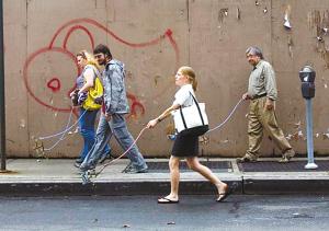 紐約街頭出現(xiàn)一幫人,牽著空狗鏈散步,他們互相逗弄對(duì)方的“隱形狗”,甚至撿拾“不存在的便便”。