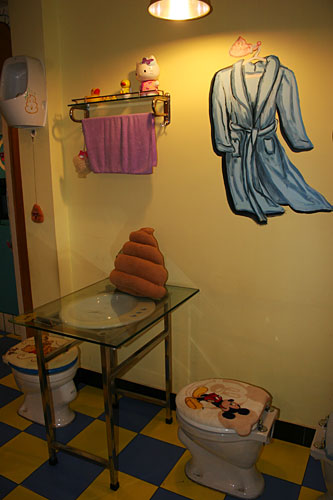 小小的門(mén)面,狹窄的樓梯。走上二樓后,這個(gè)布置得充滿了童趣的餐廳才展現(xiàn)在食客面前。這里的每把座椅都是一座標(biāo)準(zhǔn)的沖水馬桶。盛放主餐的不是盤(pán)子,而是微型馬桶,冷飲則大都放在“蹲坑”形狀的便器里。好在這些餐具造型卡通,并不會(huì)讓人大倒胃口。