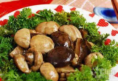原料:水發(fā)香菇、鮮蘑菇等量,植物油、醬油、白糖、水淀粉、味精、鹽、黃酒、姜末、鮮湯、麻油適量。