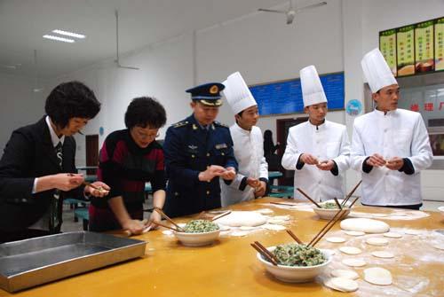 慰問團員與戰(zhàn)士一起包餃子