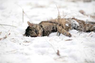 昨天清晨5點多,王阿姨在公園里又發(fā)現(xiàn)了一只被虐殺的流浪貓。王阿姨邊哭邊說,“前天傍晚我剛喂過它,沒想到今天就被人打死了!边@只被虐殺的流浪貓被王阿姨親切地叫做“小灰灰”,它兀自躺在公園東門附近的一處雪地上,腹部被殘忍地剖開,內(nèi)臟和肚腸依稀可見,毛上的血液早已凝固,但它的眼睛卻瞪得大大的。