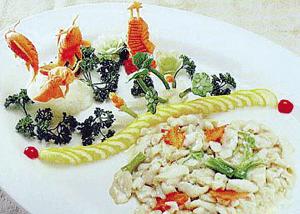 第二道墨魚(yú)籽花蝦則是以南瓜茸、蝦球、墨魚(yú)籽、麻油散子為原料制作而成,據(jù)了解,麻油散子是上海的傳統(tǒng)小吃,此菜在民間小吃的基礎(chǔ)上,增加墨魚(yú)籽、龍蝦肉等提鮮食材,經(jīng)烹調(diào)融合為一體,彰顯清淡、環(huán)保、綠色。