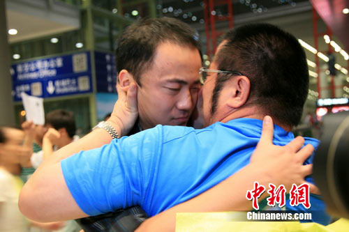 10日晚間,自湖南益陽抵京的翟田田的父親翟泰山及在京親友近十人,到北京首都國際機(jī)場接機(jī)。當(dāng)?shù)蕴锾飻y帶簡易手提袋走出機(jī)場抵達(dá)大廳時,已8年未曾謀面的父子二人相擁而泣。(完)