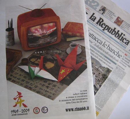 中新網(wǎng)10月3日電 據(jù)意大利《歐聯(lián)時(shí)報(bào)》報(bào)道,日前,在意大利佛羅倫薩學(xué)生學(xué)者聯(lián)誼會(huì)精心策劃下,中國(guó)國(guó)慶六十周年的宣傳廣告于10月1日被刊載在意大利共和國(guó)報(bào)紙上。廣告刊出后,引起了社會(huì)各界的高度關(guān)注,社會(huì)各界不約而同地把目光投向了中國(guó),聚焦在中國(guó)60華誕的慶典活動(dòng)。